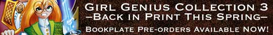 Girl Genius is a registered trademark of Studio Foglio, LLC. Agatha Heterodyne, Transylvania Polygnostic and all Girl Genius art, characters, design elements and logos & ©1999-2026 Studio Foglio, LLC., All rights reserved. Airship Entertainment™ is an imprint of Studio Foglio LLC, and publishes Girl Genius Graphic Novels on a yearly basis. Look for them in your favorite bookstore!