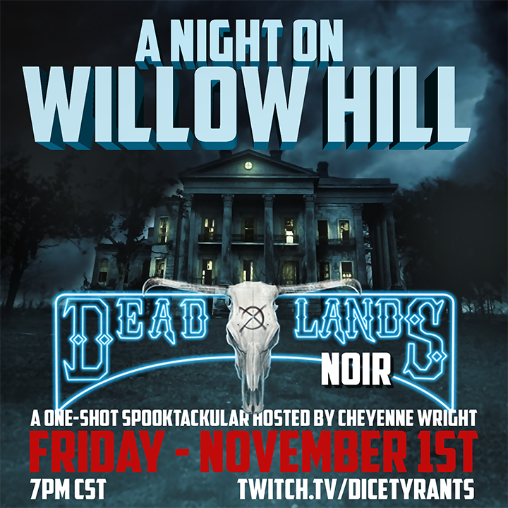 Hello boys and ghouls. Just a reminder that tonight (Nov 1st) I'll be GM'ing "A Night on Willow Hill" a livestream ghost story forthe fiends at https://www.twitch.tv/ dicetyrants - 7pm CST (8pm EST - 6pm PST). #HappyHalloween #SavageWorlds #Deadlands Come sit a spell.