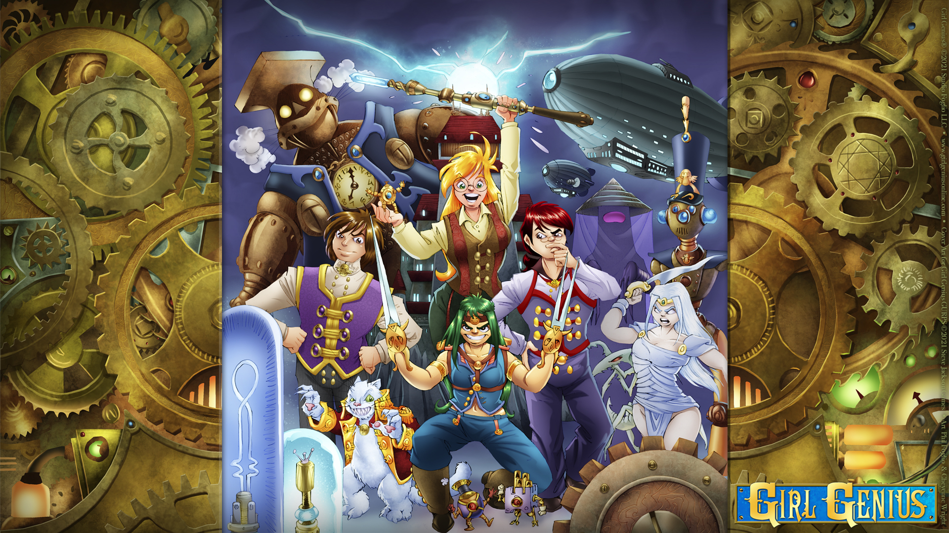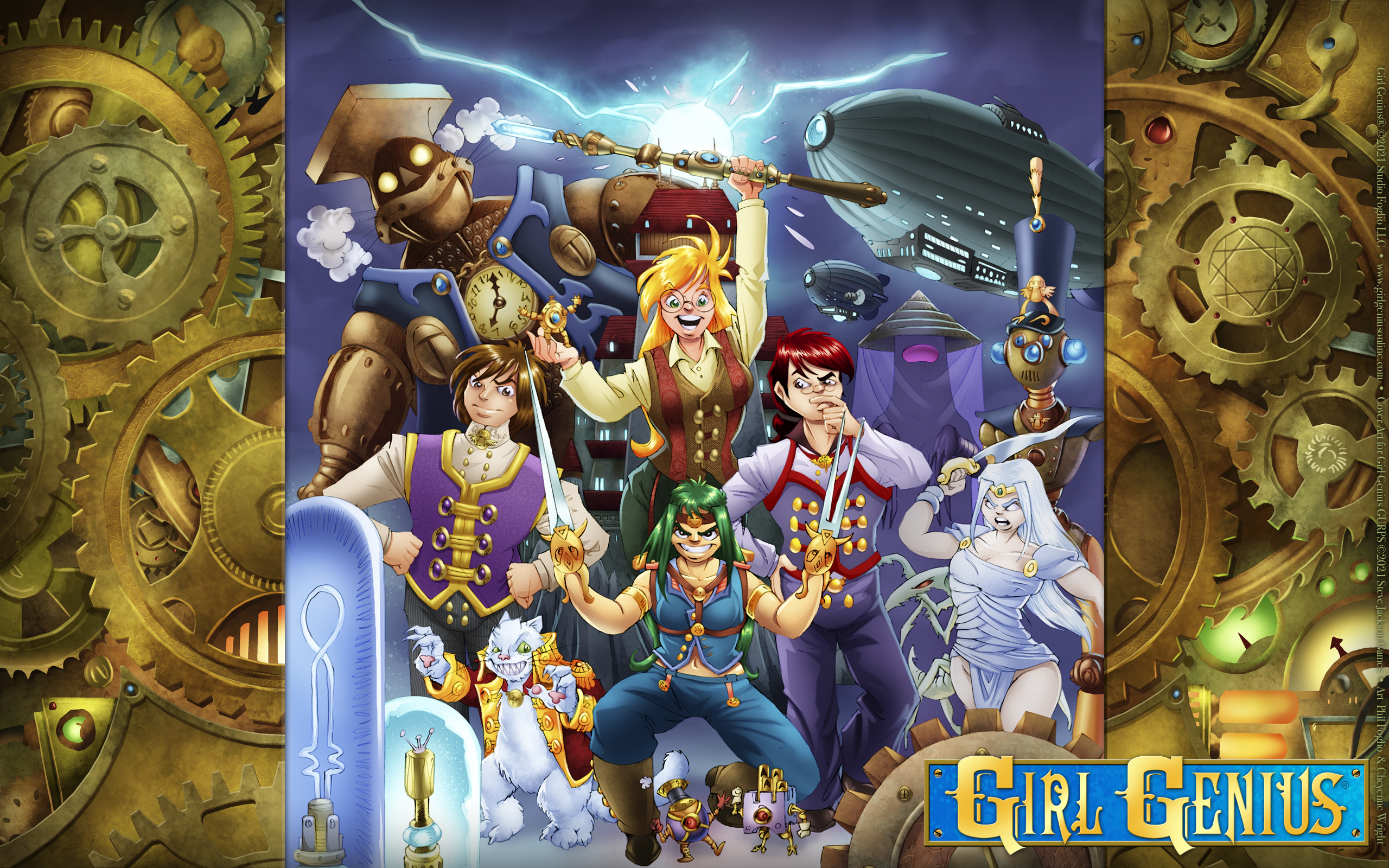 In honor of the campaign, and because Cheyenne's computer died and he couldn't work on tonight's page, here are some GURPS Girl Genius cover art wallpapers for you to download: