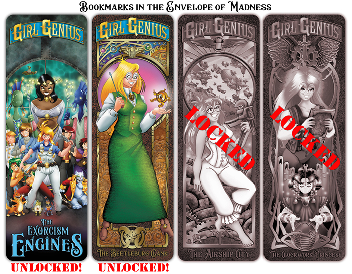 VOLUME 20 KICKSTARTER CAMPAIGN HAS FUNDED! We'll be printing the usual softcover and fancy puffy first edition hardcover of Volume 20, as well as reprinting Volumes 1, 2 and 5! The big news is that, twenty-odd years in, we're going to do a new, mass-market hardcover edition as we reprint those old volumes. It won't be the fancy version, those will still be the lovely collectible volumes they've always been, but it will make hardcover editions available once again. The Envelope of Madness is filling up nicely with signed bookplates and bookmarks, plus an art card from the Mechanicsburg Guild of Monsters! --Kaja ---------------------------------------------------------------- CHEYENNE HAS MADE THIS AMAZING VIDEO AND YOU SHOULD WATCH IT! See the opening for his Victorian space opera Axion on YouTube! ---------------------------------------------------------------- THE BACKERKIT STORE FOR VOLUME 19 IS OPEN! I've still got the BackerKit store open for Sparks and Monsters! I'm done shipping the backer rewards for the Kickstarter campaign, but I'll keep the store open for a while longer. ----------------------------------------------------------------