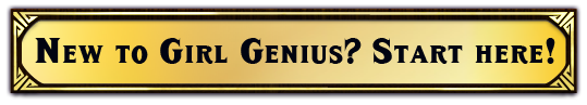 Girl Genius is an ongoing adventure story in which the characters grow, change, run around the landscape quite a bit, and occasionally even die. Because of this, we recommend that new readers start the Girl Genius story from the very beginning. Trust us, it makes more sense that way. The good news is that the entire archive is now available for online reading!